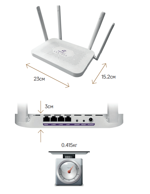 Маршрутизатор имеет 4 внешние несъемные антенны с усилением 5дБи каждая.