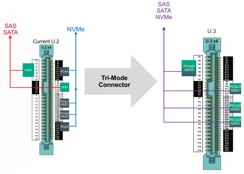 U.3 – развитие форм-фактора U.2, предложенное для унификации подключения разных типов накопителей в серверах. Накопители U.3 физически аналогичны 2,5-дюймовым дискам с разъёмом SFF-8639, при этом разъём и бэкплейн стандарта U.3 могут автоматически поддерживать три протокола: SATA (AHCI), SAS (SCSI) и PCIe (NVMe). То есть в один и тот же отсек U.3 сервера можно установить либо SATA SSD, либо SAS SSD, либо NVMe SSD – контроллер сам переключится на нужный режим. Такая универсальность удобна в корпоративных системах. Сами же SSD U.3 обычно являются NVMe-накопителями, совместимыми с U.2 (U.3 диск может работать в старом U.2 слоте в режиме NVMe, и наоборот).